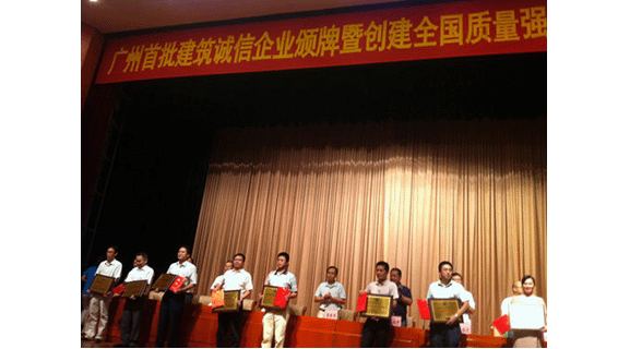 2013年9月11日上午,廣州市建筑業(yè)聯(lián)合會組織召開了“廣州市‘首批建筑業(yè)誠信企業(yè)’頒牌暨創(chuàng)建全國質量強市示范城市報告大會”,邵云平會長、市城鄉(xiāng)建委李希平副巡視員、建筑業(yè)聯(lián)合會副會長及廣州地區(qū)相關獲獎建筑企業(yè)領導、項目經(jīng)理、質量、技術管理負責人、施工技術人員等600余人參加大會,會議表彰了我市首批33家建筑業(yè)誠信企業(yè)。總包公司作為 “廣州市建筑業(yè)誠信企業(yè)”達標企業(yè)之一,曾國勝副總經(jīng)理代表公司上臺領了獎。