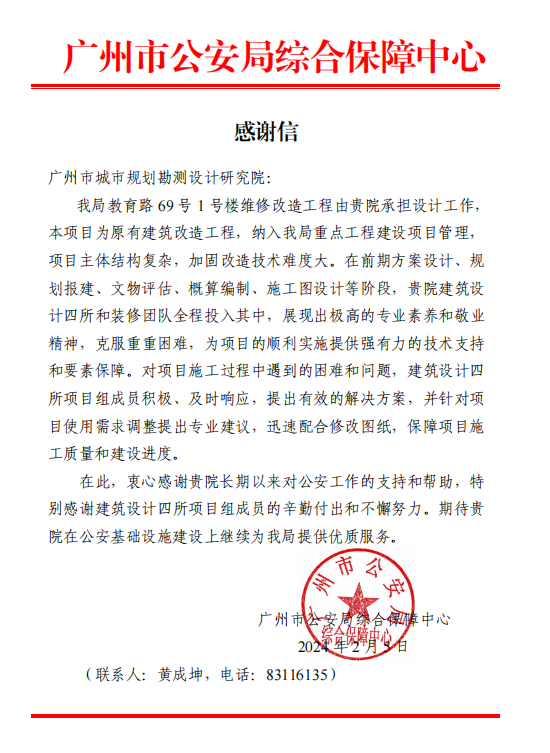 近日,廣州市公安局綜合保障中心發(fā)來感謝信,衷心感謝規(guī)劃院和我公司對教育路 69 號 1 號樓維修改造工程設(shè)計工作的支持,對我公司裝修設(shè)計團隊在室內(nèi)方案設(shè)計及施工圖設(shè)計階段展現(xiàn)出的專業(yè)能力和敬業(yè)精神,保障了項目...
